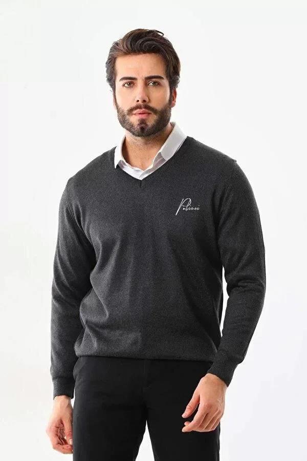 Baskılı V Yaka Uzun Kol Dokuma Triko - Füme (BMC-126872)