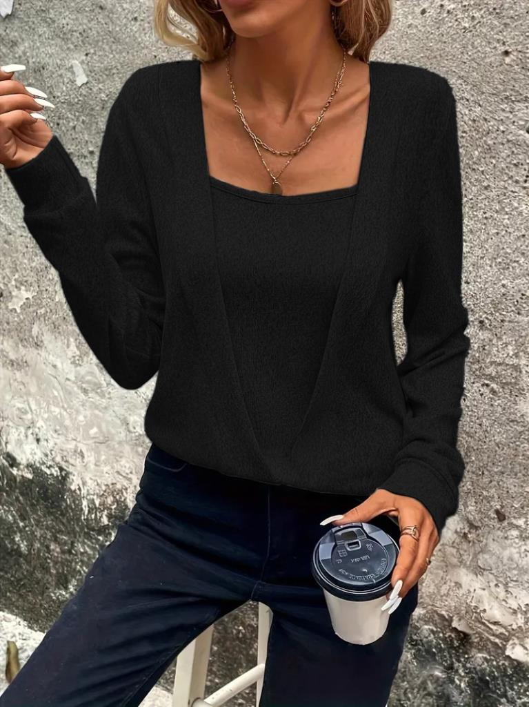 Kadın Uzun Kollu Kruvaze Yaka Kol Ve Etek Ucu Manşet Detay Yumoş Bluz