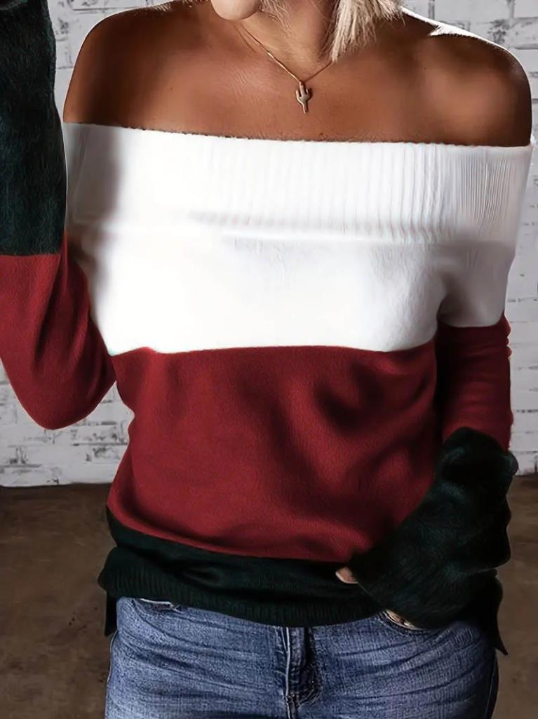 Kadın Uzun Kollu Omuzlardan Açık Uzun Kollu Blok çizgili Triko Bluz