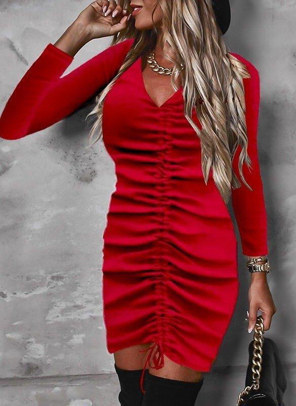 Kadın Uzun Kollu V Yaka önden Yırtmaç Büzgü Detay Kaşkorse Mini Boy Elbise