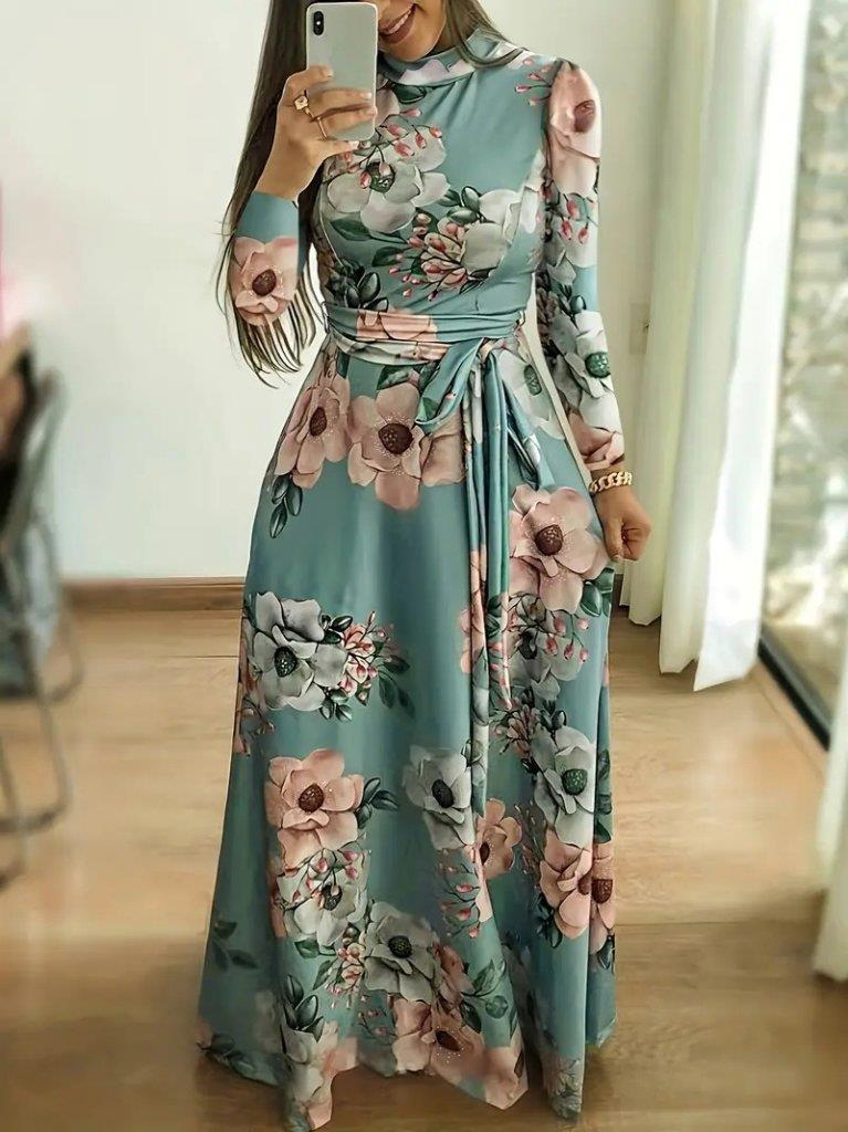 Kadın Uzun Kollu Yuvarlak Yakalı Beli Kuşaklı Desenli Süprem Uzun Elbise (BMC-174363)